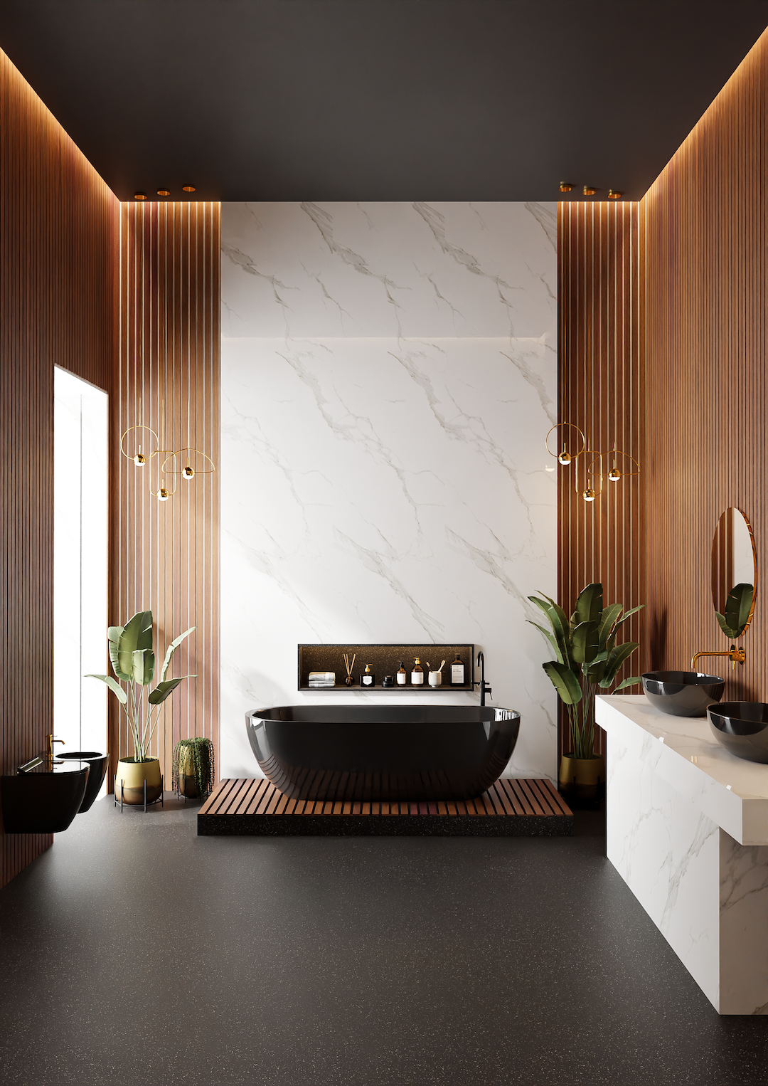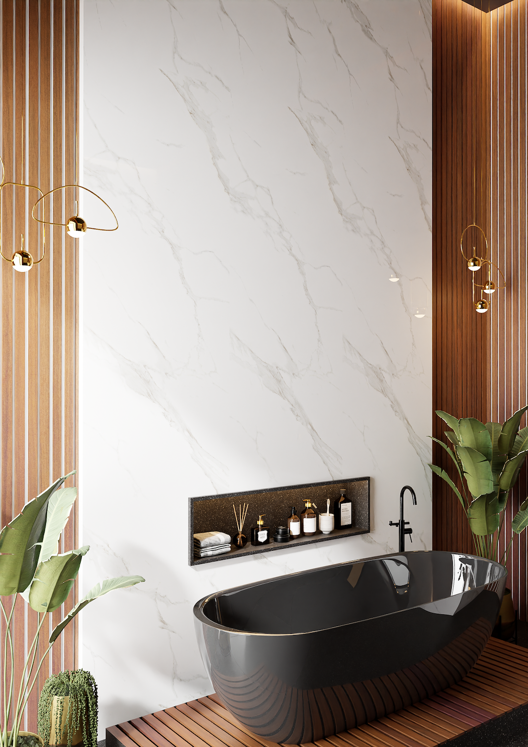 Statuario Fantastico features bold and dramatic grey veining against a pure white marble background, creating a luxurious and striking aesthetic. Ideal for creating focal points in high-end spaces, it exudes sophistication and elegance.